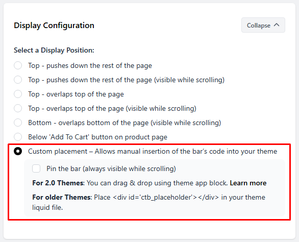 To begin, make sure the Custom placement option is enabled in your bar campaign under the Display Configuration section.