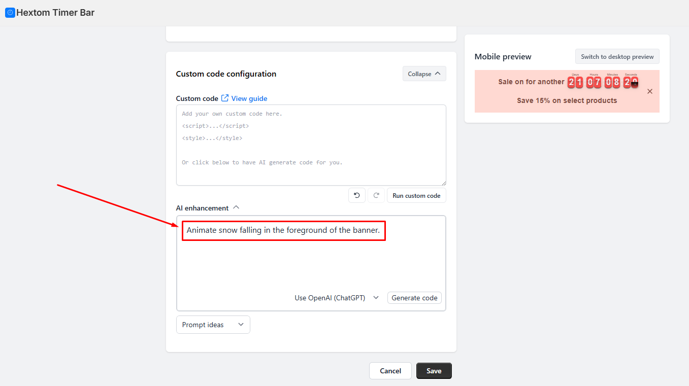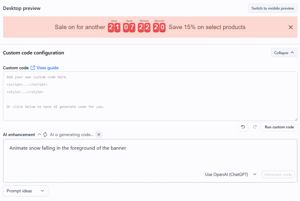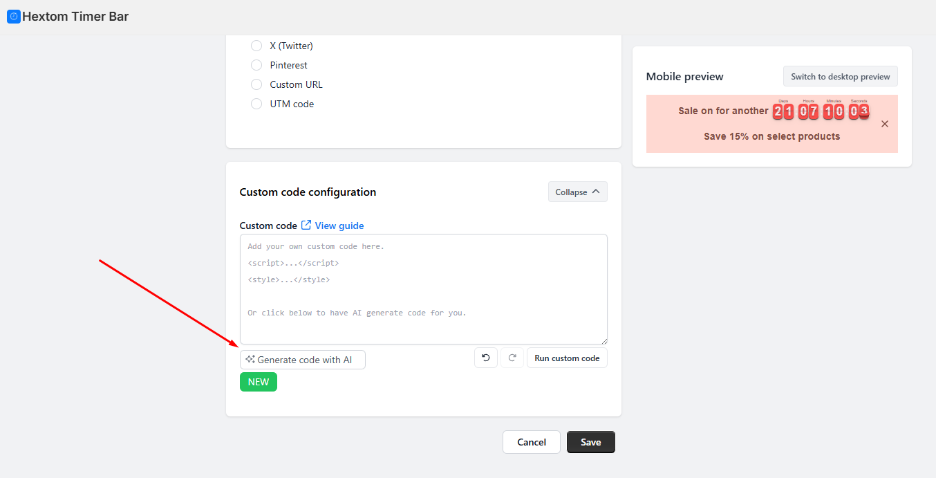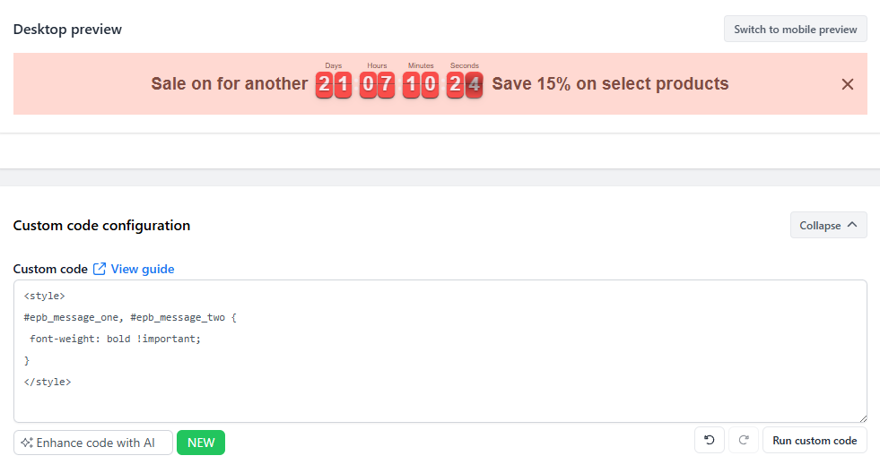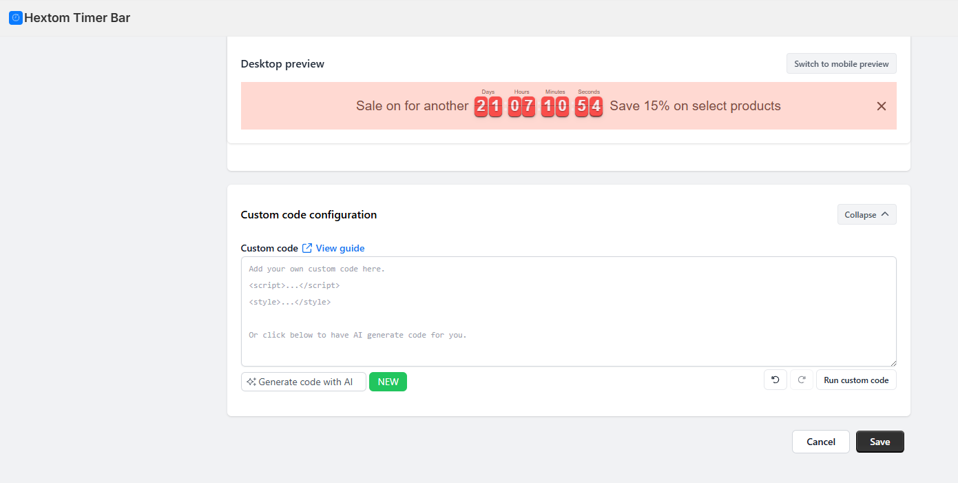 The Custom Code feature allows you to add your own CSS or script to customize the look and behavior of your countdown timer bar. This gives you more flexibility beyond the settings available in the app.