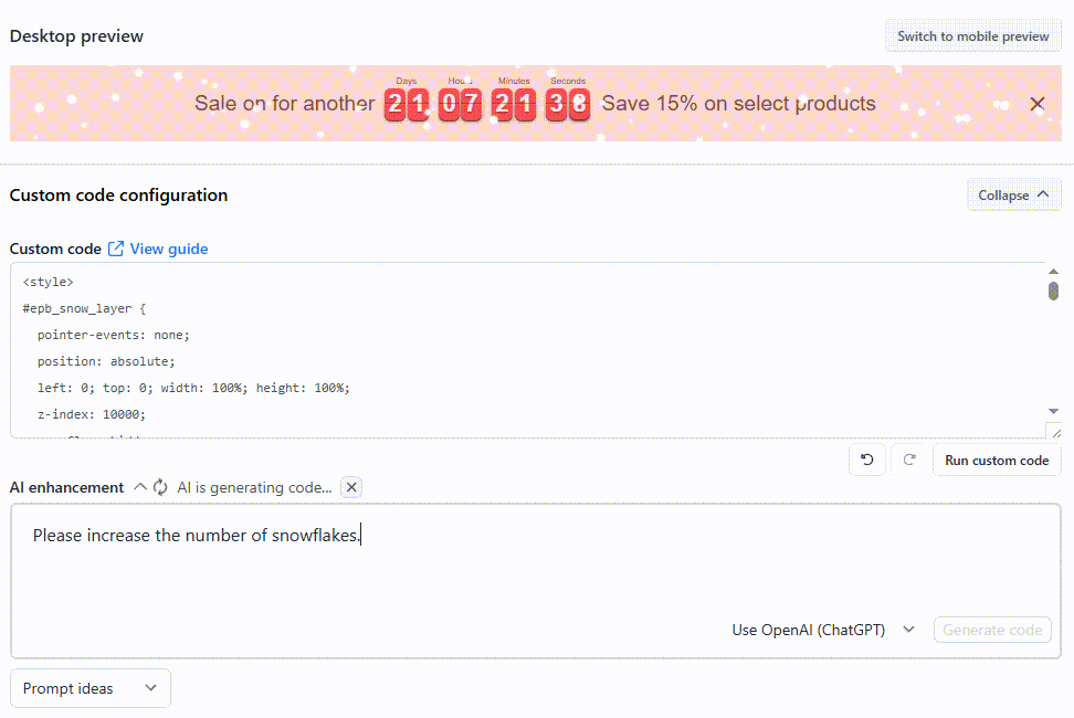Enter a new prompt (example: "Please increase the number of snowflakes.") while keeping the existing code in the box