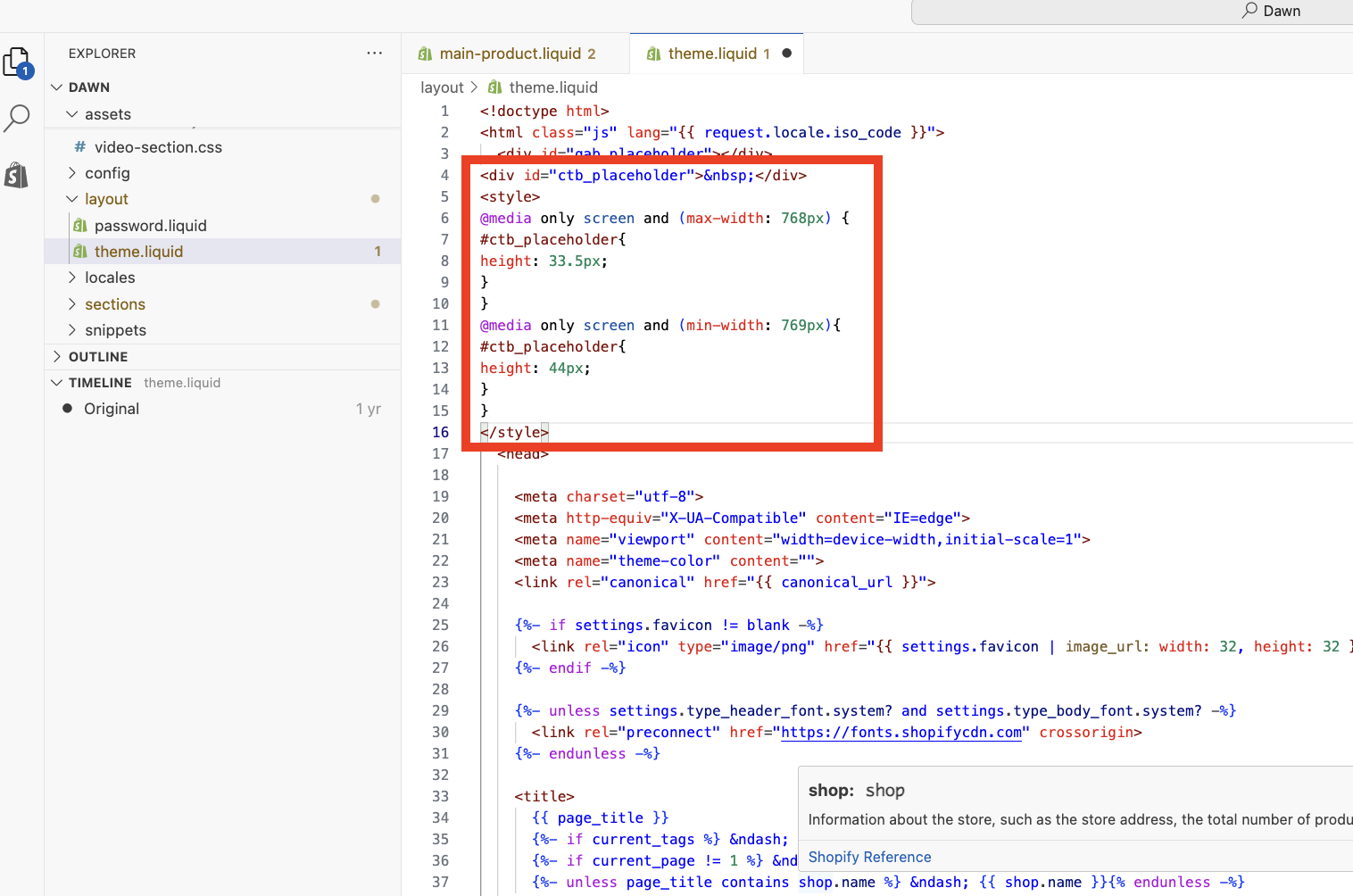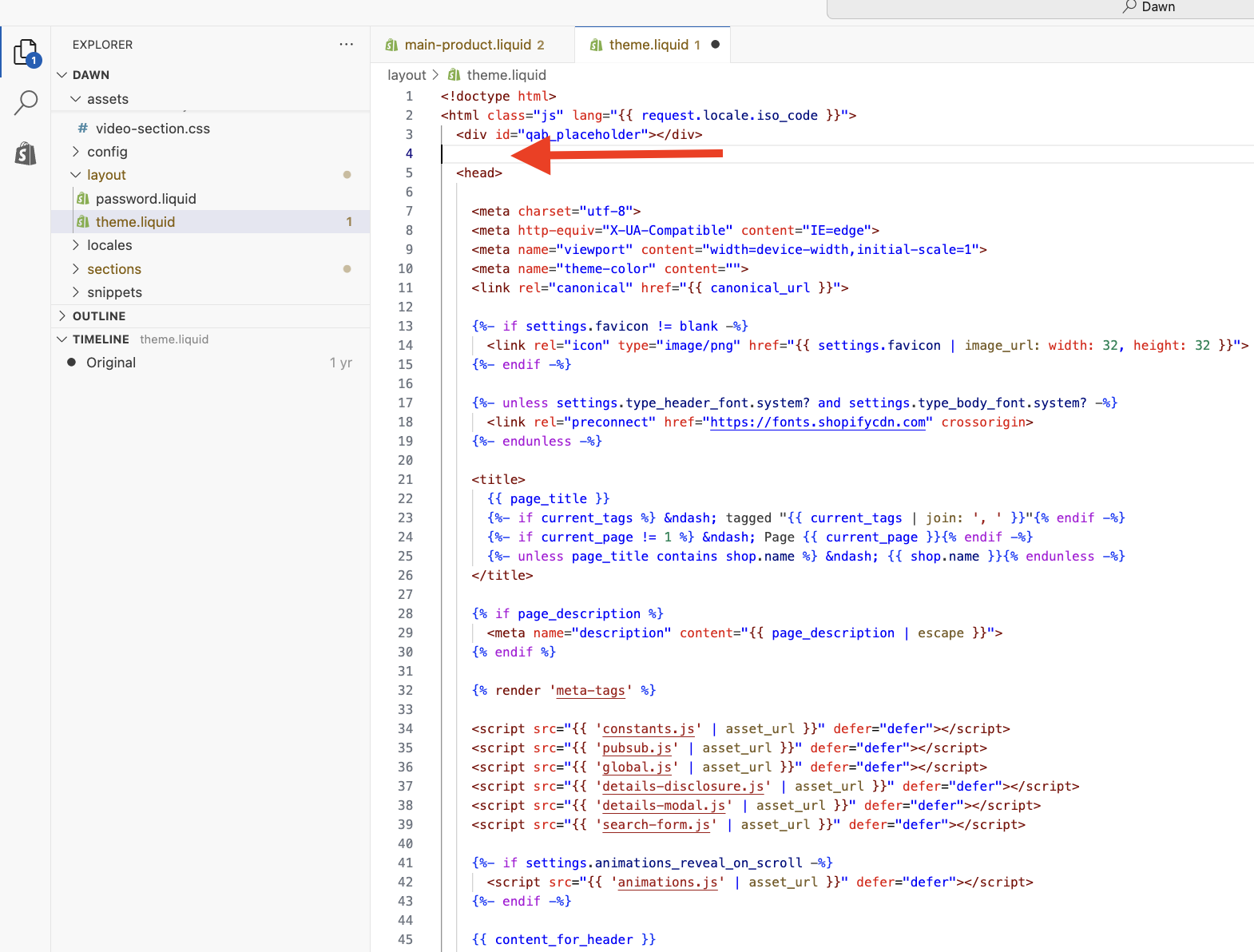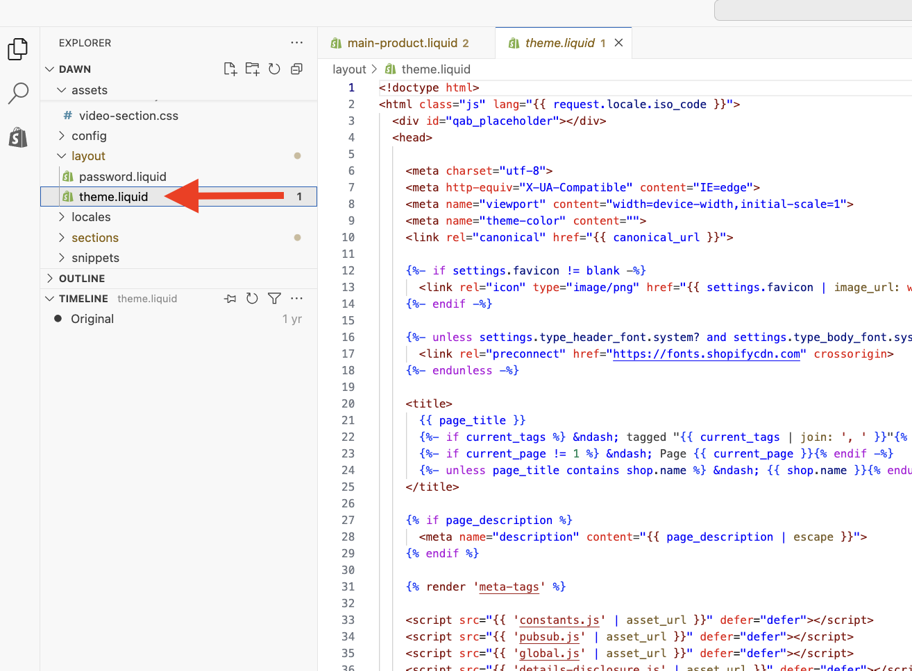 - Click on theme.liquid found inside the Layout folder.
