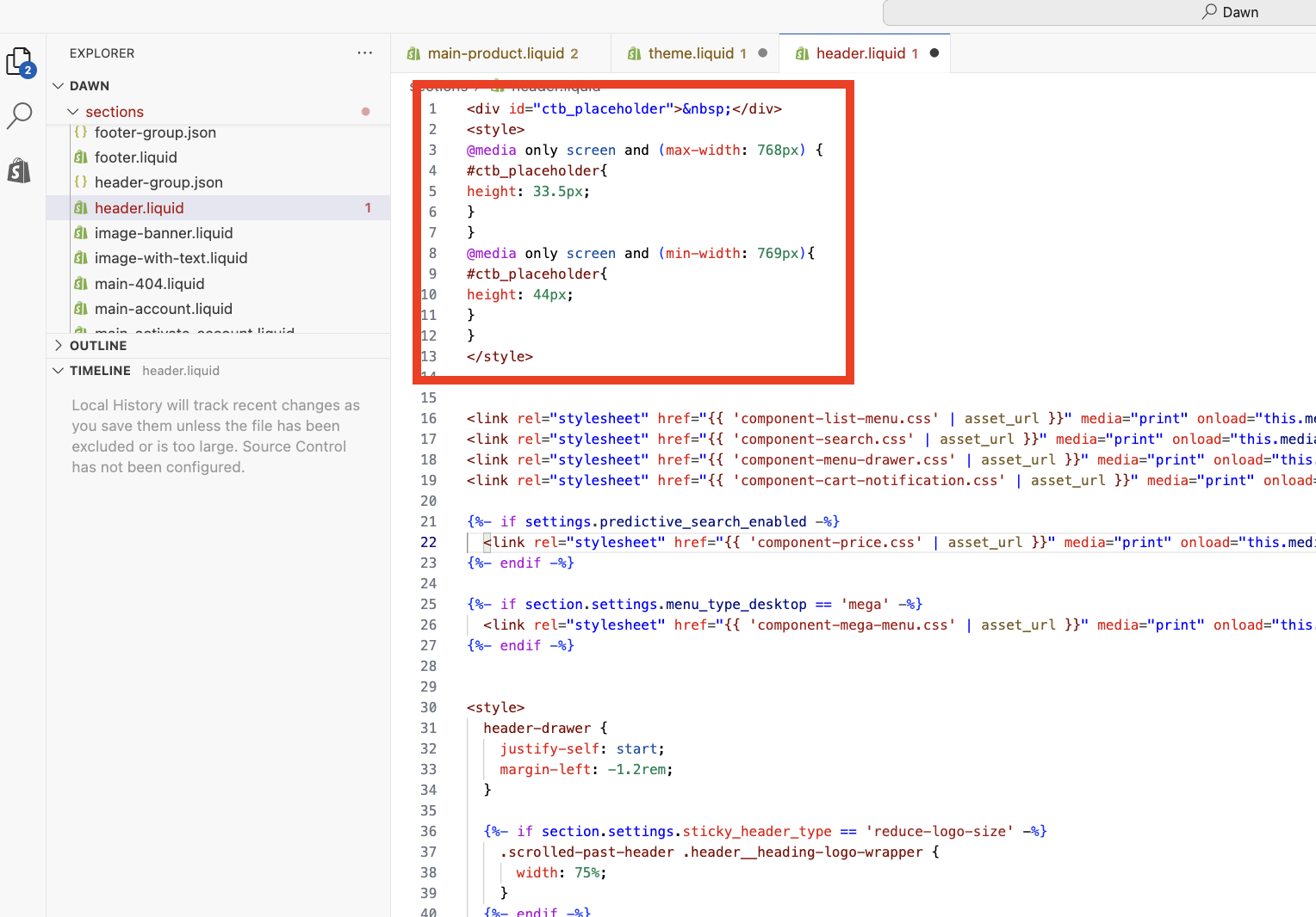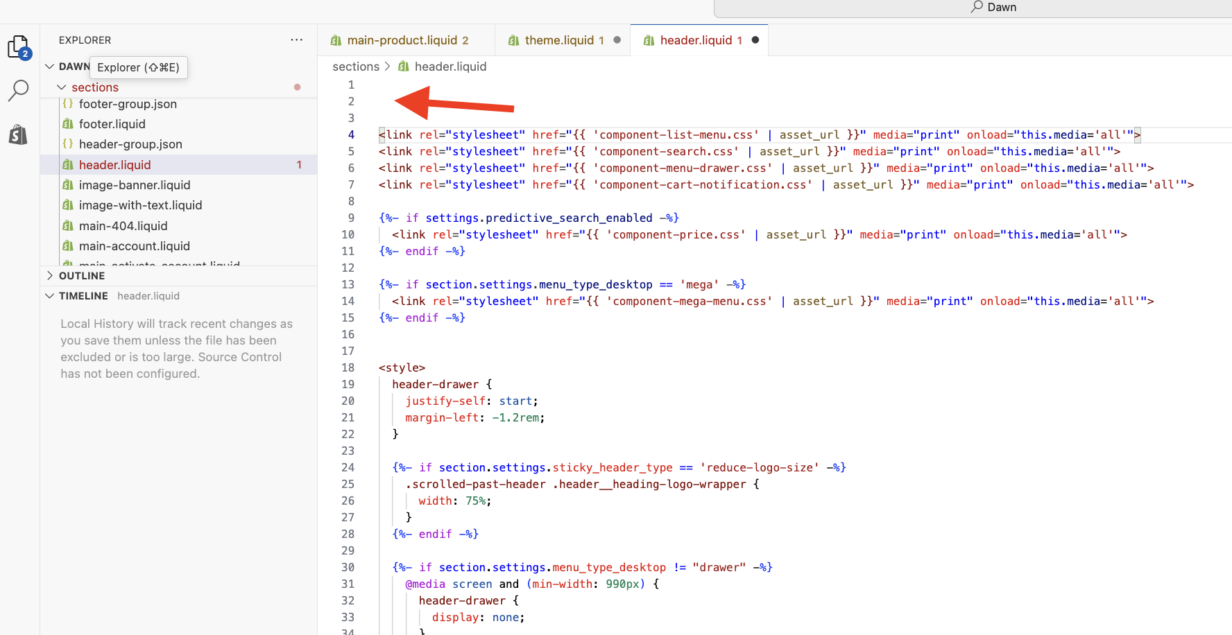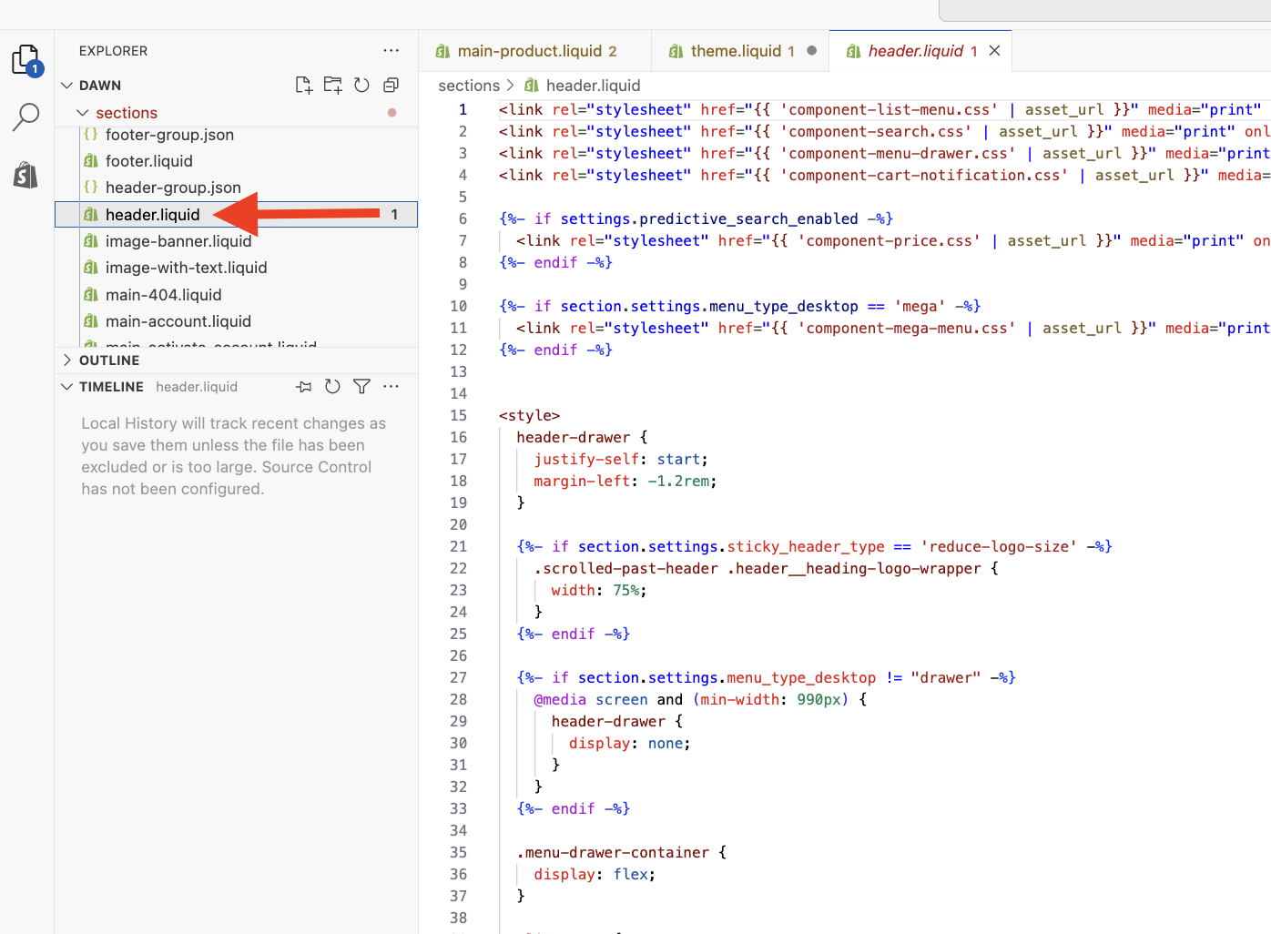 - Inside the Sections folder you'll find the file header.liquid. Open that file.